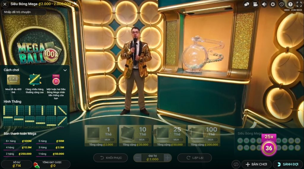 Siêu Bóng Mega có một cái Máy hút bóng và 400 thẻ chơi. Mỗi thẻ sẽ có hình dạng 5×5 chứa 24 số riêng biệt được sắp xếp ngẫu nhiên với một ô vuông trống ở khu trung tâm, đó là ô vuông được đánh dấu. Bạn sẽ chiến thắng nếu có được một hàng ngàng, hàng dọc hoặc hàng chéo gồm 5 ô vuông, tối đa thắng 9 hàng trên mỗi tấm thẻ.