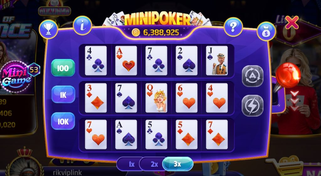 Mini Poker gồm có 3 hàng chơi, kết quả của bạn sẽ phụ thuộc vào những lá bài hiện lên trong 3 hàng chơi này. Khi nhấn Quay, mỗi hàng chơi sẽ được hệ thống chia cho 5 lá bài ngẫu nhiên trong bộ bài 52 lá tiêu chuẩn. Người chơi có thể chọn chơi 1 hoặc 2 hoặc cả 3 hàng chơi một lúc.