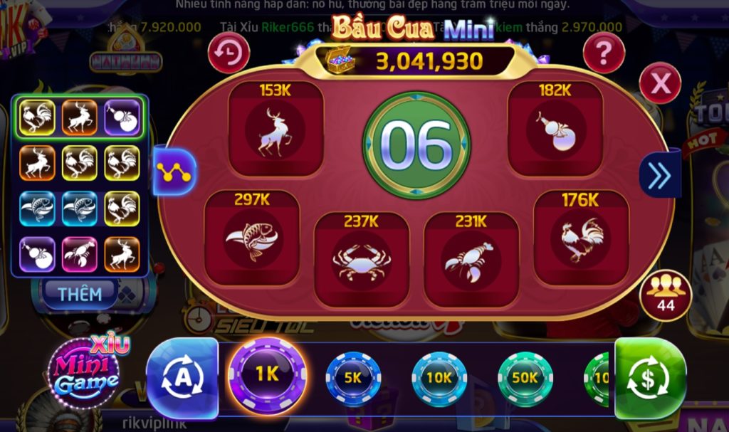 Khi tham gia chơi Bầu Cua Mini tại Rikvip, bạn cũng có cơ hội trúng nổ hũ trí giá cả chục triệu đồng. Dường như các minigame tại Rikvip rất thích đưa vào tính năng Nổ hũ để tạo điều kiện cho người chơi ăn được nhiều tiền. Mức cược cho mỗi ván chơi trải dài từ 1K cho đến 5M lận.
