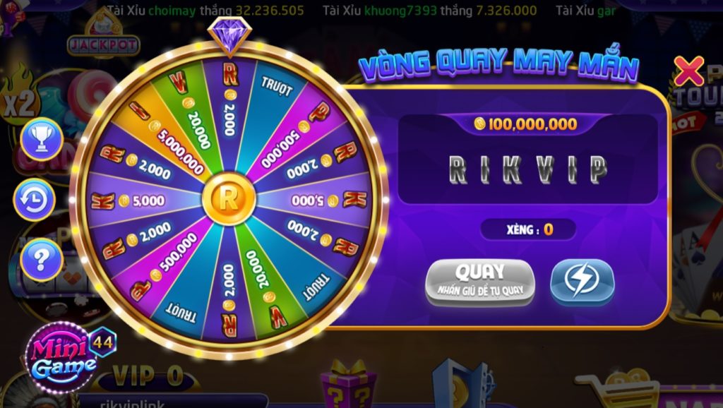 Người chơi sẽ sử dụng “Xèng” để quay Vòng quay may mắn tại Rikvip. Cứ 5 Xèng thì đổi được 1 lượt quay, phần thưởng cao nhất trong game là khoảng hơn trăm triệu.
