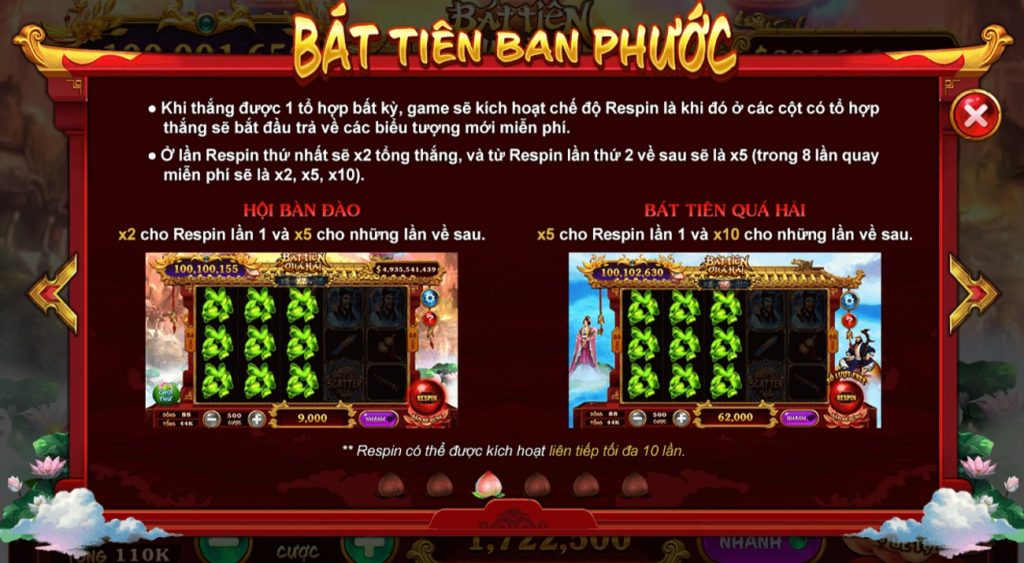 Vậy làm thế nào để có thể trúng Nổ hũ? Trong quá trình quay, chỉ cần quay thắng cược là bạn sẽ có cơ hội gặp Vương Mẫu và được ban thưởng nổ hũ cực khủng. Nếu anh em cược càng to thì cơ hội càng lớn, phần thưởng càng hấp dẫn. Chỉ cần đặt mức giá trị cược từ 125 trở lên là sẽ có cơ hội ăn nổ hũ rồi, mức cược thấp hơn thì chơi cho vui thôi không được gì cả đâu.