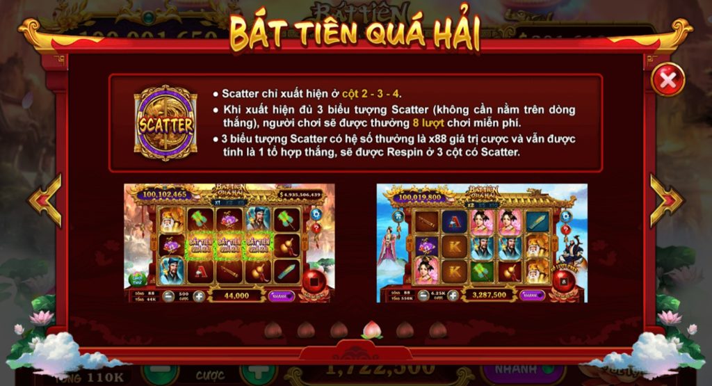 Nếu như may mắn xuất hiện 3 biểu tượng Scatter trên màn hình thì người chơi được thưởng 8 lượt chơi miễn phí chế độ đặc biệt với hệ số nhân x2 x5 x10. Một khi đã trúng 3 biểu tượng Scatter thì chắc chắn hôm nay bạn đã chơi lãi ra tiền.