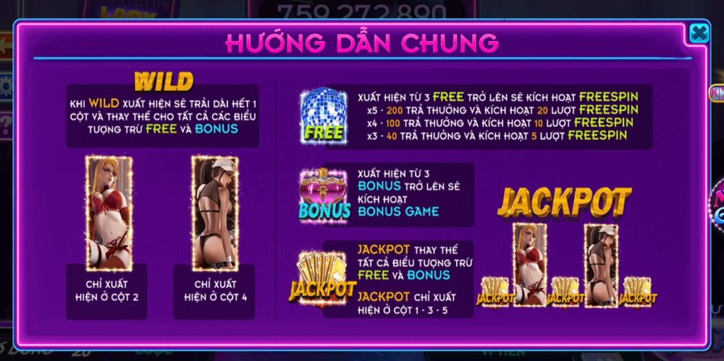 Vậy làm thế nào để có thể trúng Nổ hũ? Nếu như bảng kết quả trả về có 3 biểu tượng Jackpot + 2 biểu tượng WILD thì bạn sẽ trúng ngay con Nổ hũ hàng trăm triệu đồng, kèm theo đó là 2 em nóng bỏng múa cột khiêu gợi để ăn mừng cùng với bạn.