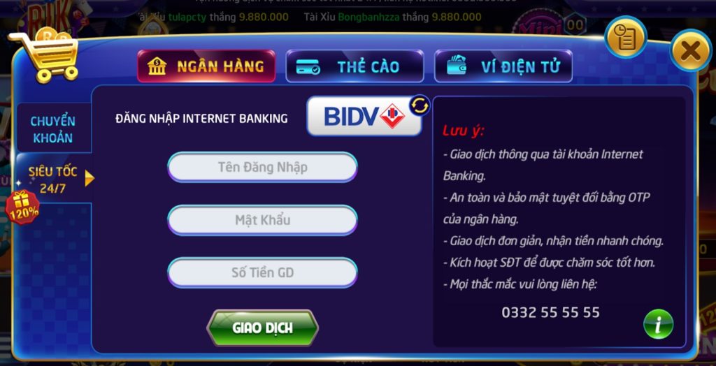 Nạp tiền thông qua ngân hành là hình thức nạp tiền chính của hầu hết tất cả người chơi tại Rikvip. Hiện tại cổng game Rikvip hỗ trợ nạp tiền qua 5 ngân hàng: Vietcombank, BIDV, ACB, Vietinbank và Sacombank. Đây là 5 ngân hàng có tốc độ chuyển khoản nhanh nhất Việt Nam hiện nay nên chỉ cần 30 giây sau là tiền chạy vào tài khoản Rikvip.