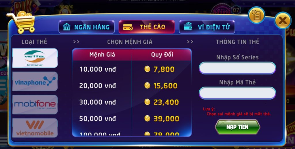 Hình thức nạp tiền qua thẻ cào truyền thống vẫn luôn là lựa chọn tốt nhất đối với các game thủ. Mua thẻ cào, nhập PIN và số seri thẻ là tiền sẽ vào tài khoản.