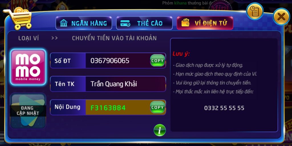 Nạp tiền thông qua ví điện tử Momo là phương thức nạp tiền cũng rất được ưa chuộng tại cổng game Rikvip với tốc độ nhanh (gần như là ngay lập tức). Sắp tới thì Rikvip sẽ cập nhật thêm cả ví ViettelPay.